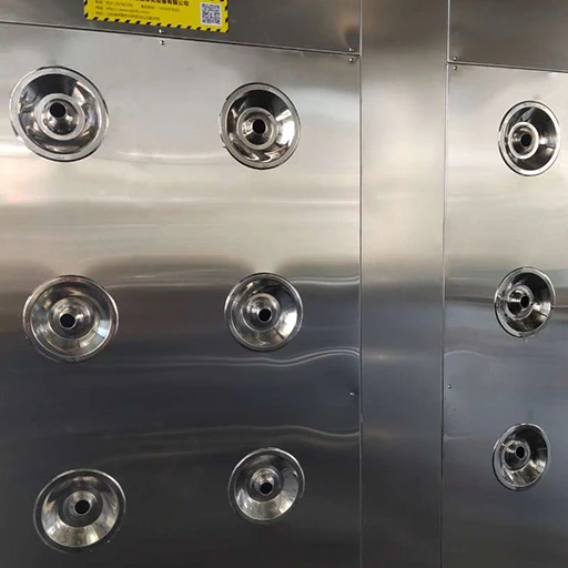 This model requires manual opening and closing of the doors. The door closers of the four doors have a 90-degree positioning function. When all the doors are opened and fixed, the goods can enter the air shower and blowing. Of course, this model is suitable for scenes where the transportation of goods is not very frequent. And we can customize the size of this model according to the reserved size on site and the size of the goods.